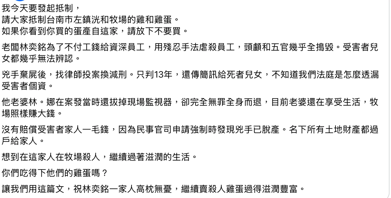 被害人親友今天發起抵制「殺人蛋」,指稱用殘忍手法虐殺員工,投案換減刑只判13年,所有土地財產都過戶給家人,沒有賠償受害者家人一毛錢。想到這家人在牧場殺人,繼續過著滋潤的生活。你們吃得下他們的雞蛋嗎?