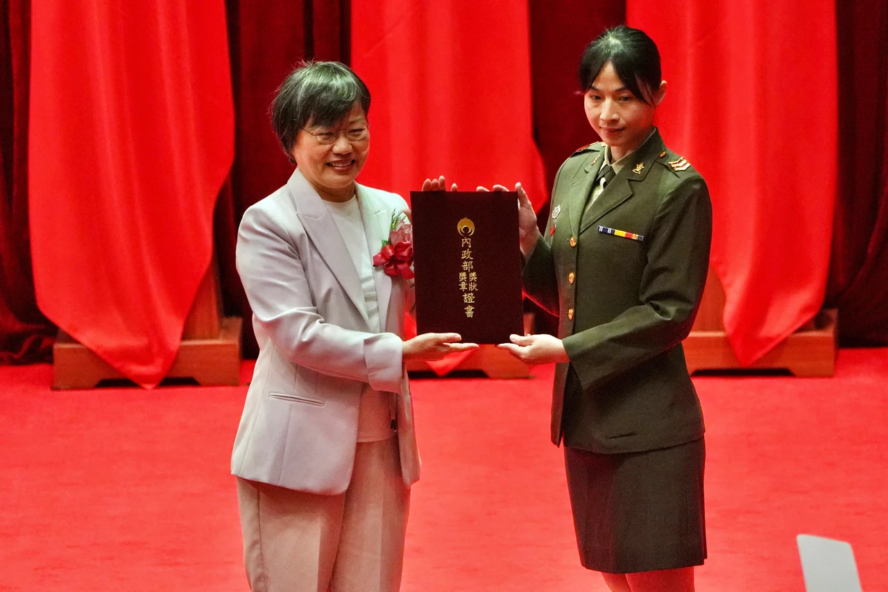 內政部長劉世芳致詞時說,兵役制度從原四個月延長成一年,感謝處理役政業務的同仁、國防部各級管理幹部,與每一個中央、地方政府及公私立大專院校、民間團體的協助,大家過去一年對國家、機構的貢獻,整合起來是全民的民防整備與社會韌性,也代表國家安全最基礎工作的第一步。