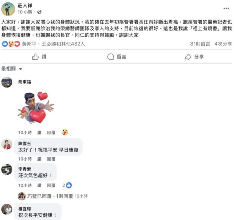 莊人祥昨(10/4)晚在中秋連假首日發文表示,謝謝大家關心他的身體狀況,他的確在去年初疾管署署長任內診斷出胃癌,跑疾管署的醫藥記者也都知道。他要感謝診治他的榮總醫師團隊及家人的支持,目前恢復的很好,「這也是我說『祖上有燒香』讓我身體恢復健康,也謝謝我的長官、同仁的支持與鼓勵。謝謝大家。」