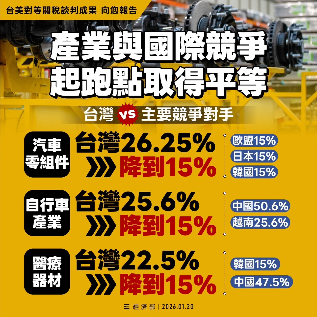 龔明鑫進一步說明,過去台灣面臨的是「20%+N」的疊加稅率,平均稅率高達23.81%,如今降至15%,已與日本、韓國及歐盟站在同一競爭基準點上,且相較中國、越南等主要傳產競爭國,台灣條件更具優勢,整體降幅也高於日、韓及歐盟。