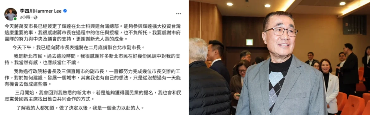 【記者曾伯愷/新北報導】台北市副市長李四川今天下午露過臉書發文宣佈辭職,正式投入2026新北市長選舉。新北市長侯友宜、副市長劉和然今晚也在臉書發文「全力支持」,願與李四川並肩戰鬥。