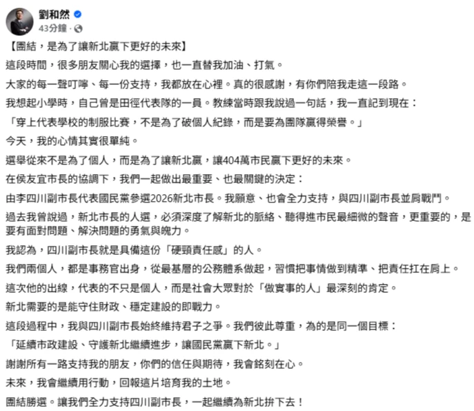 劉和然說,選舉從來不是為了個人,而是為了讓新北贏,讓404萬市民贏下更好的未來。他說,在侯友宜市長的協調下,一起做出最重要、也最關鍵的決定,由李四川副市長代表國民黨參選2026新北市長。所以他願意、也會全力支持「與四川副市長並肩戰鬥」。