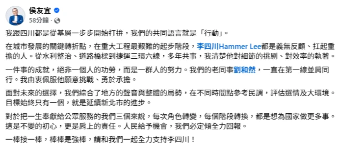 對於李四川宣佈爭取國民黨提名,全力以赴投入2026新北市長選舉,新北市長侯友宜間今晚也透過臉書回應,侯友宜說,他跟李四川都是從基層一步步開始打拚,他們的共同語言就是「行動」。