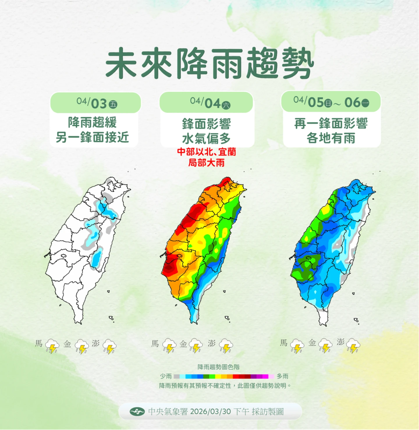 周五(3日)為清明連假第1天,水氣是4天中最少的一天,另一鋒面接近,午後中北部與山區降雨機率提升。周末(4至5日)鋒面影響最為明顯,中部以北及東北部有陣雨或雷雨,並可能出現局部大雨,尤其4日兒童節全台有雨且最劇烈。下周一(6日)再有鋒面接近,各地降雨機率再度提高。