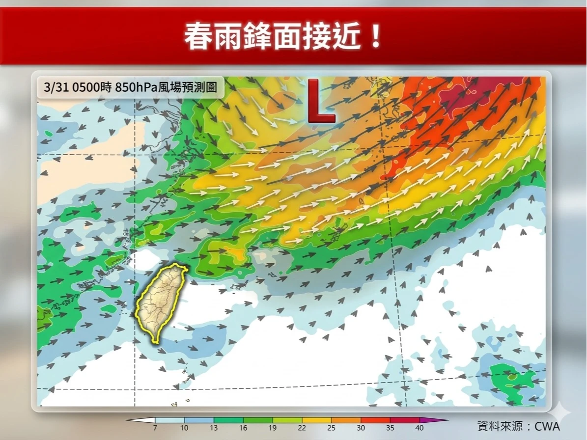 【記者陳亮諭/綜合報導】本周首波鋒面正在路上,中央氣象署指出,今(31日)鋒面接近中,北部及宜蘭降雨機率增高,西南風助長高溫,北台灣估有30°C,台南、高雄、屏東及台東亮高溫黃燈36°C。清明連假僅第1天周五(3日)水氣較少,周六(4日)全台有雨且雨勢最劇烈。