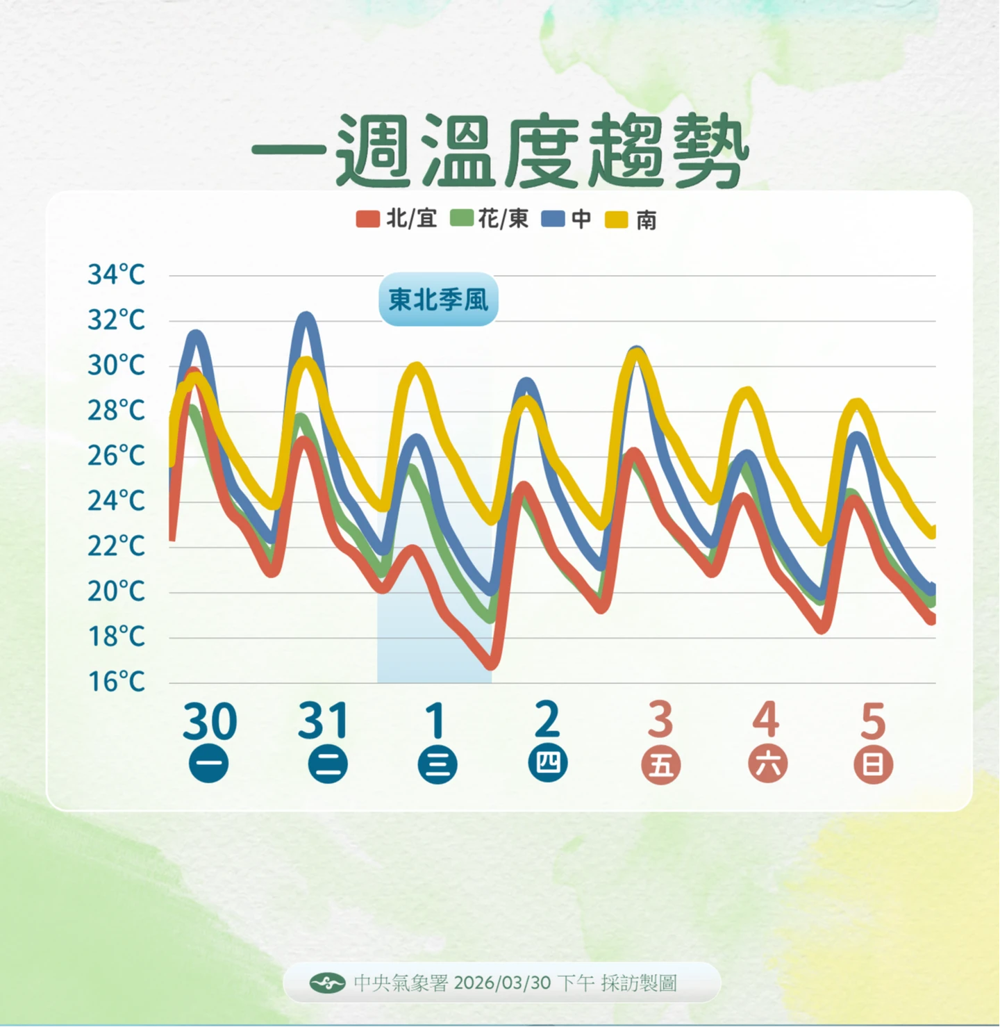 4月起東北季風吹襲降溫。中央氣象署提供 zoomin