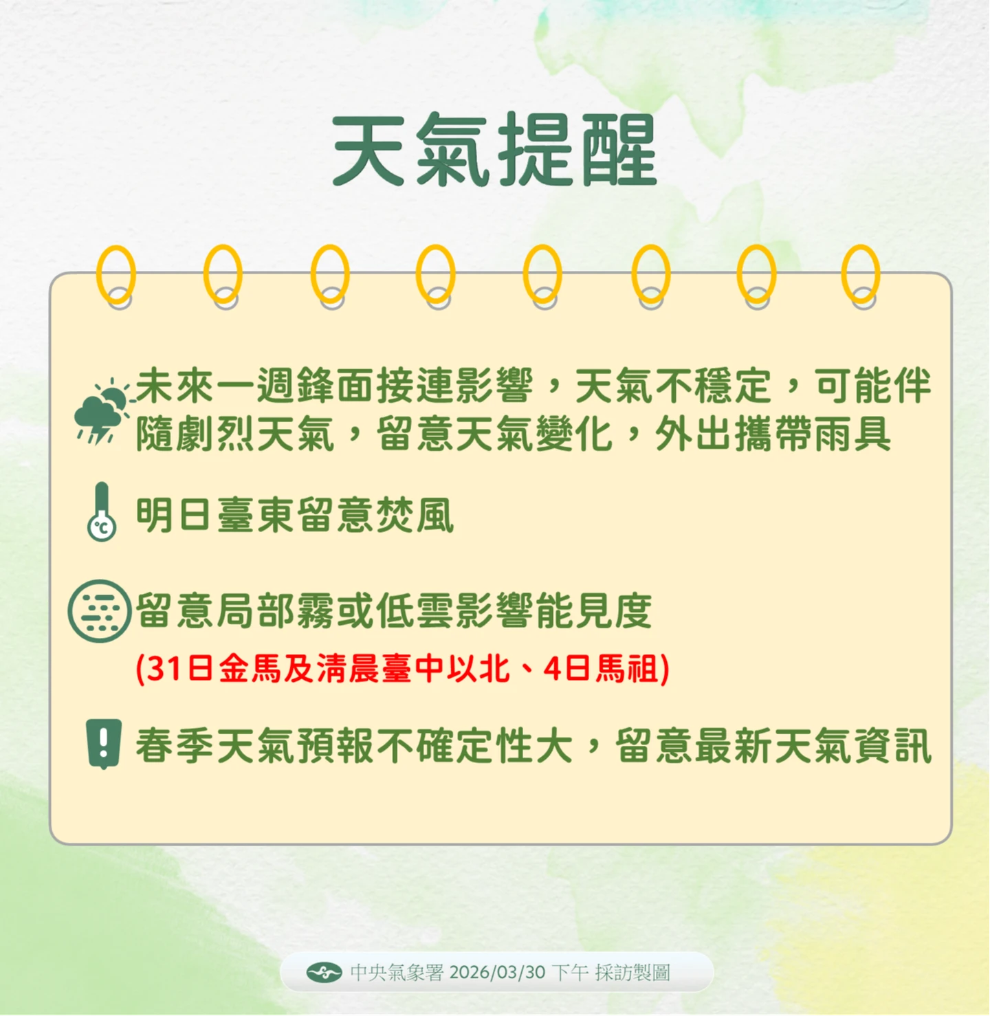明進入4月,氣象署說,明天(1日)鋒面通過並伴隨東北季風增強,北部及東北部轉涼,中部以北及東北部有陣雨或雷雨,局部可能出現較大雨勢。周四(2日)東北季風減弱,氣溫回升,但水氣仍多,各地仍有短暫降雨。