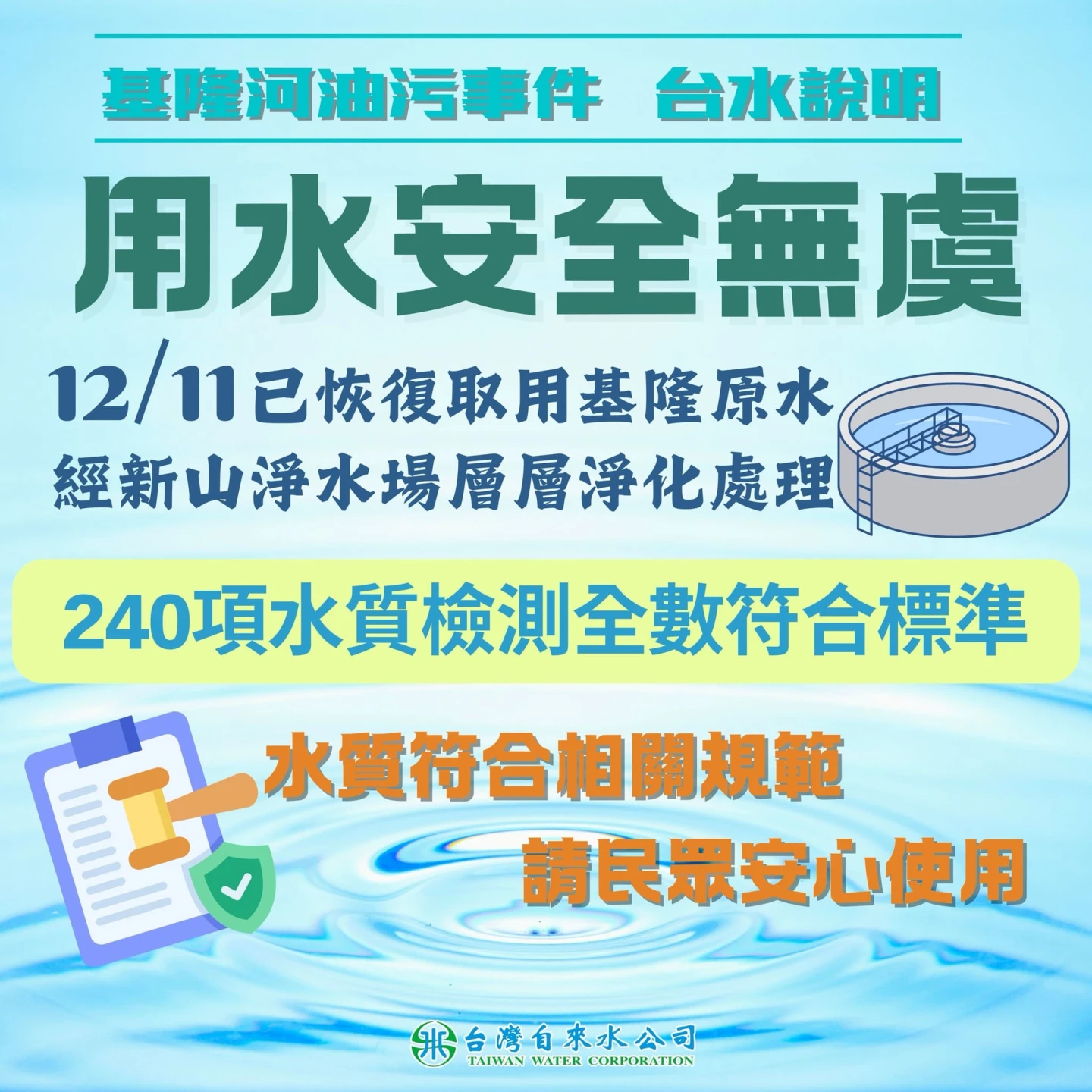 台水公司昨表示,基隆河油污事件, 12月11日恢復取用基隆河原水,經新山淨水場淨化處理後,已正常供水。