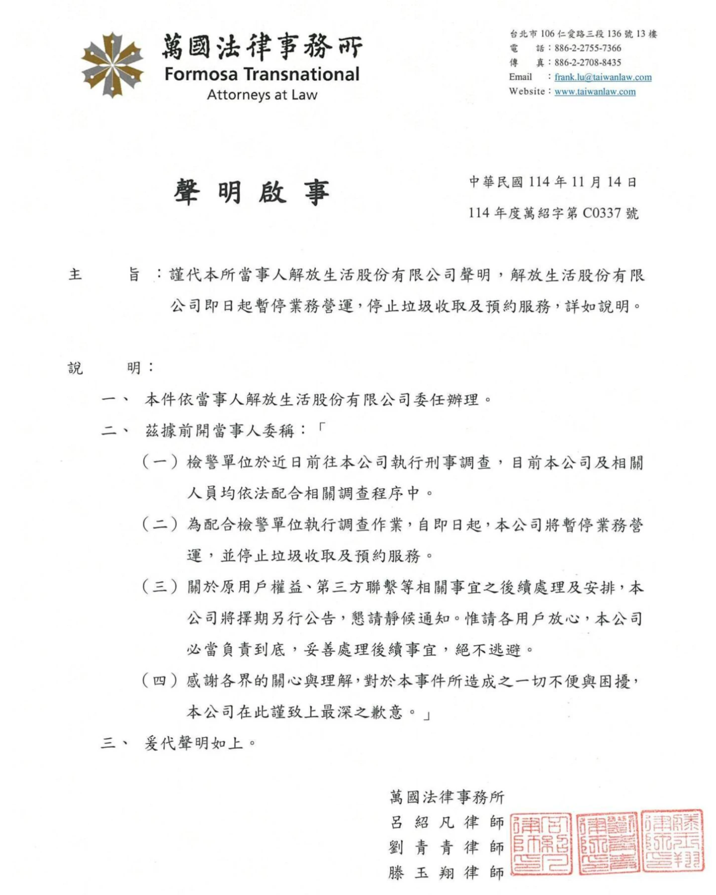 「圾可」官網貼出律師事務所聲明,指出解放生活股份有限公司即日起暫停業務營運,停止垃圾收取及預約服務。