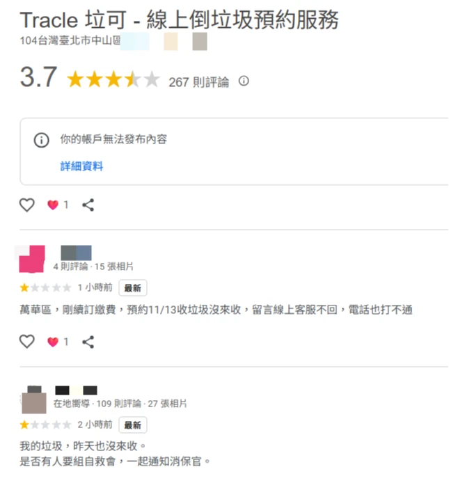 近期「Tracle垃可」評論中湧入大量一星,抱怨預約好的時間卻無人來收垃圾,有人就留言指出,「這三天都沒來收垃圾,LINE客服傳訊息都沒回應,電話也沒人接,有人跟我遇到相同狀況嗎?」還有人被告知今日停收,但卻有清潔員抵達,照算次數。