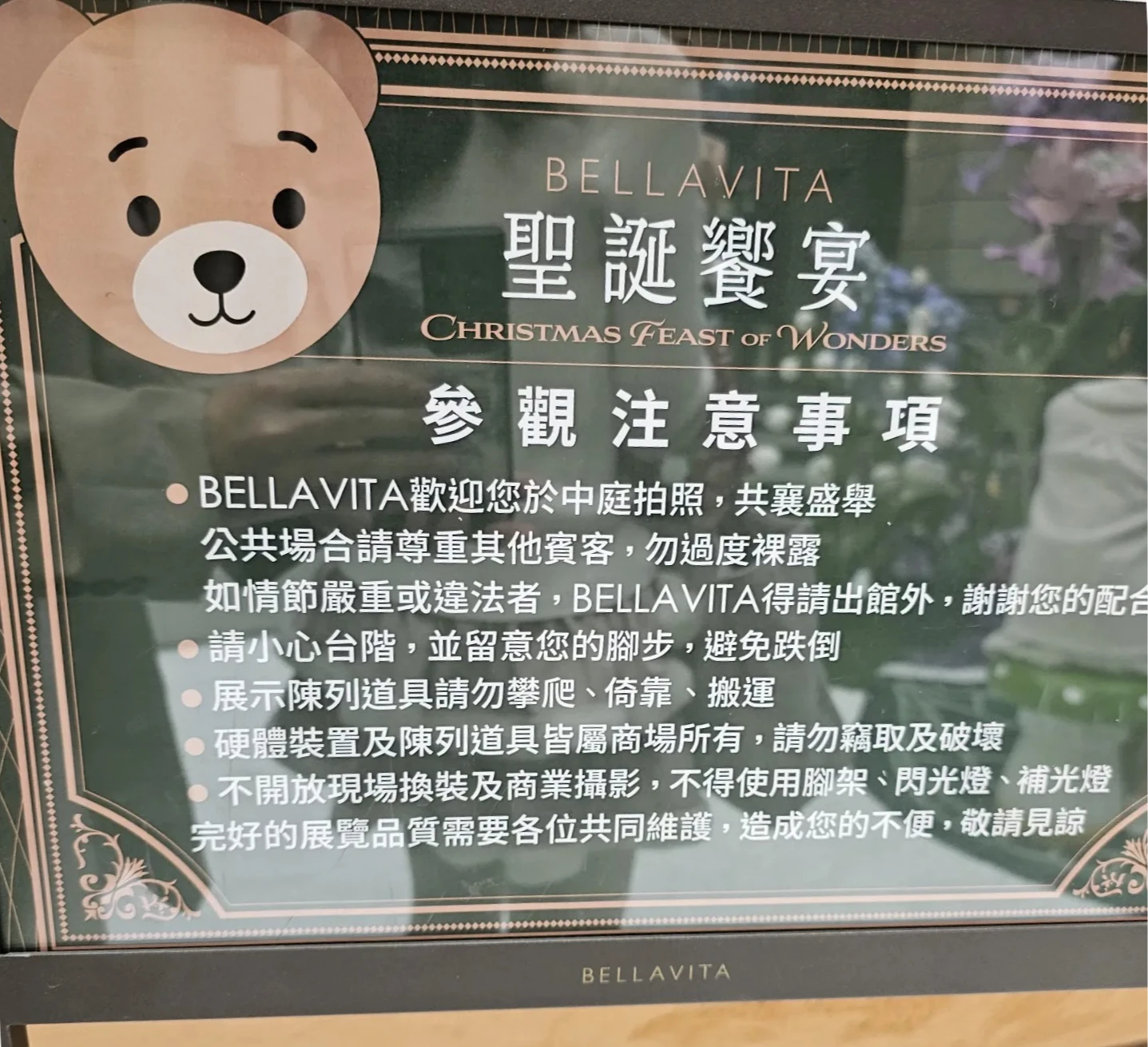 儘管BELLAVITA歡迎民眾進入中庭與巨型聖誕小熊「Bello Bear」合影互動,但現場已立牌明確註明「參觀注意事項」。立牌上清楚載明:「展示陳列道具請勿攀爬、倚靠、搬運」、「硬體裝置及陳列道具皆屬商場所有,請勿竊取及破壞」等警語。