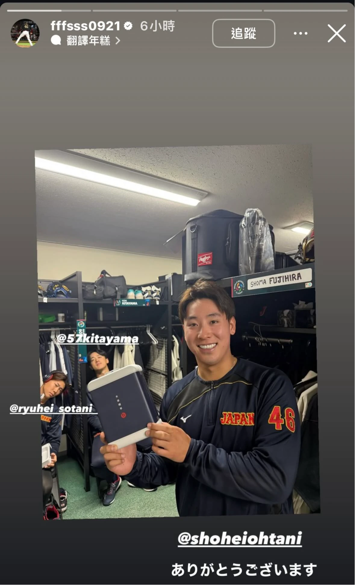 結束日本東京的C組預賽,日本武士隊馬上動身準備前往美國邁阿密,參加接下來的經典賽8強複賽,在出征邁阿密前,大谷翔平以實際行動向全隊表達感謝之意。日本隊投手藤平尚真在IG發布限動表示,收到大谷翔平送的Beats耳機,照片裡藤平尚真手上拿著印有「大谷翔平」字樣的禮盒,禮盒上還印有「Beats」的LOGO,大谷翔平是Beats的代言人,所以可以看出這是大谷翔平為隊友們精心準備的禮物。