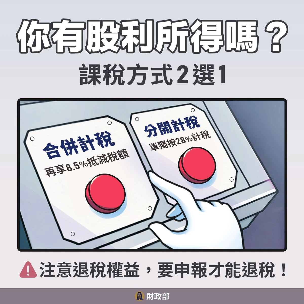 分開計稅適合高所得者。財政部指出,股利所得按 28% 稅率單獨計稅,再與其他各類所得所計算的應納稅額加總。