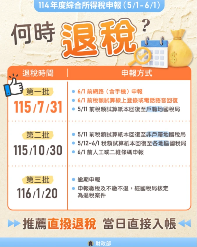 114 年度所得稅申報期間為 5 月 1 日至 6 月1日,退稅分三批進行。取自FB@財政部 zoomin