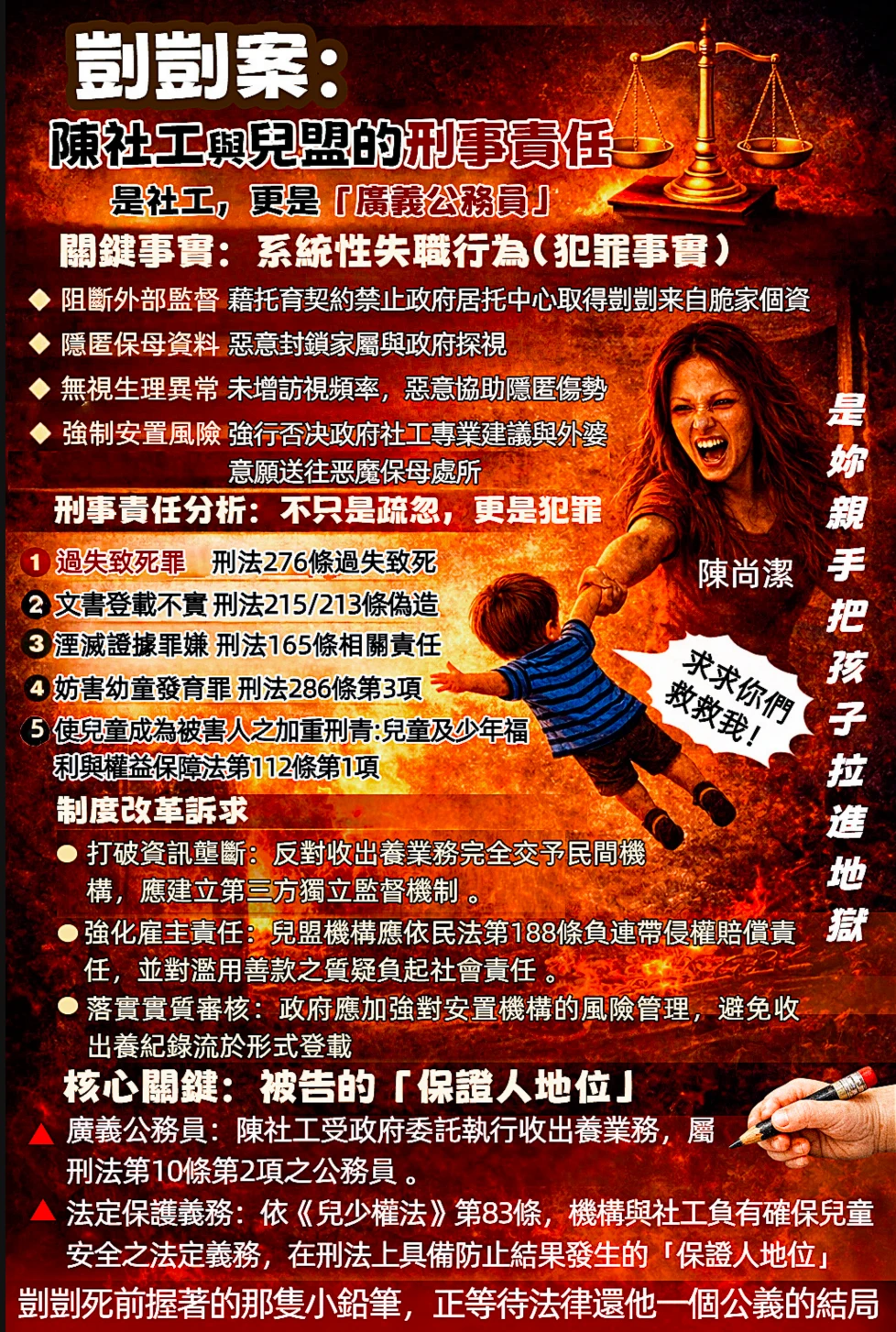 剴剴戰士製作海報,列出社工陳尚潔的罪責。兒少守護行動團體提供 zoomin
