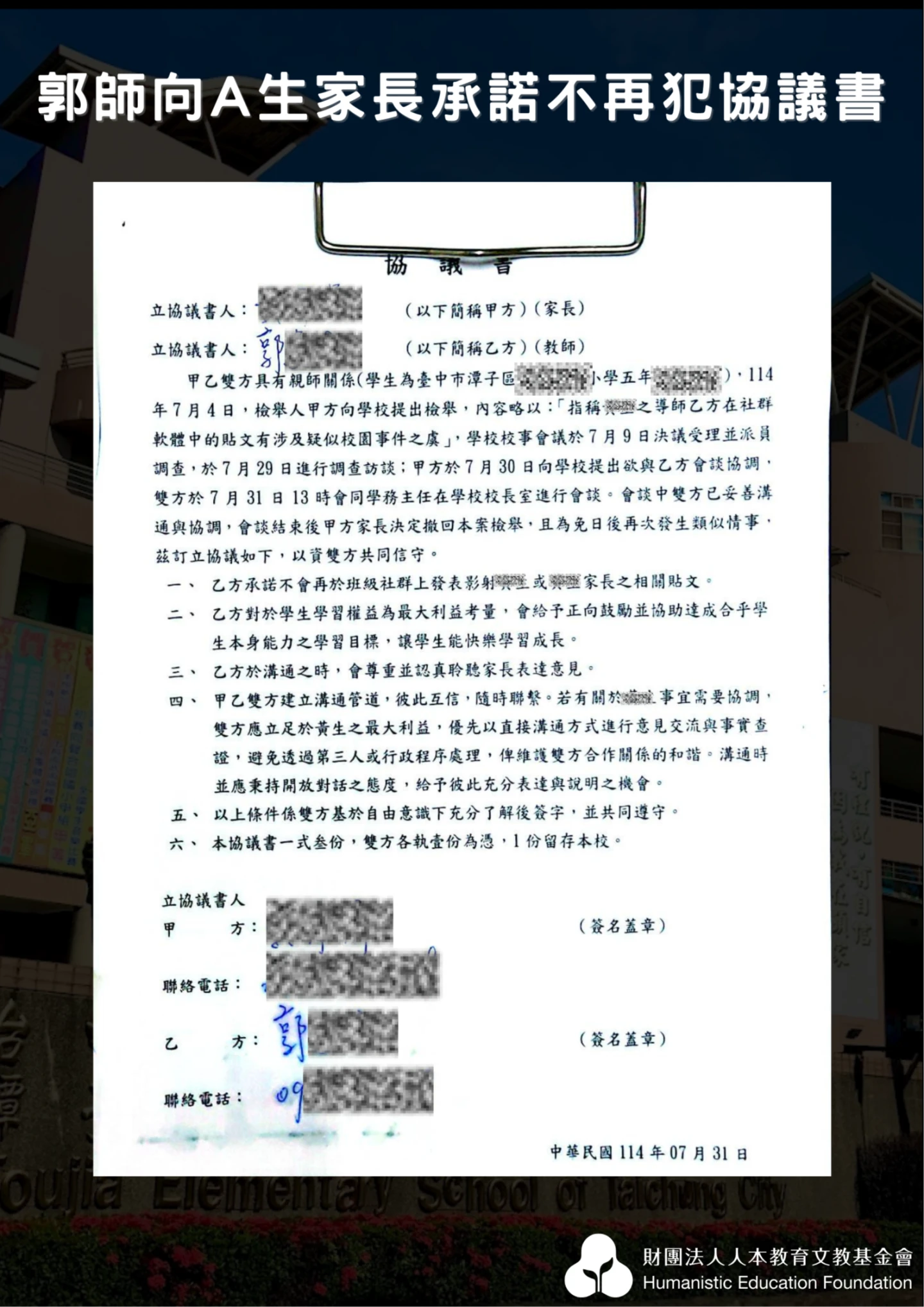 人本中辦主任曾芳苑表示,A生與家長在五年級下學期首次向校方檢舉,經校方協調達成和解,郭師並於協議書中承諾不再影射學生及家長,並以學生學習權益為最大考量。然而A生升上六年級後,郭師情緒失控與公開羞辱行為不減反增,情節更加嚴重。家長近日提出第二次檢舉後,校事會議決議暫時將郭師調離導師職務。