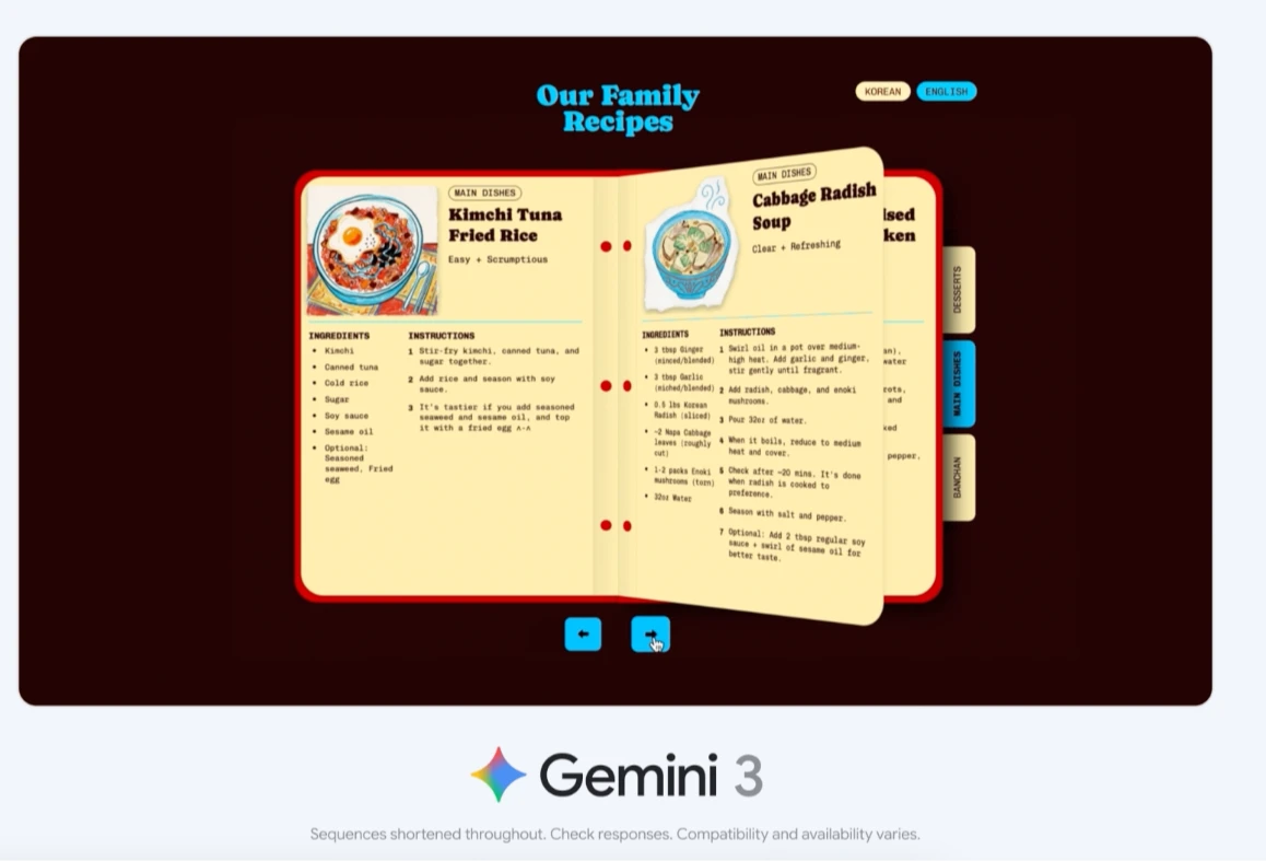 根據Google高層在簡報會表示,Gemini 3能夠轉換資訊格式,並根據單一提示產生視覺化內容或應用程式。例如,他們示範了當使用者詢問旅行計畫時,Gemini 3可以產生包含可點擊互動元件的視覺化圖表。