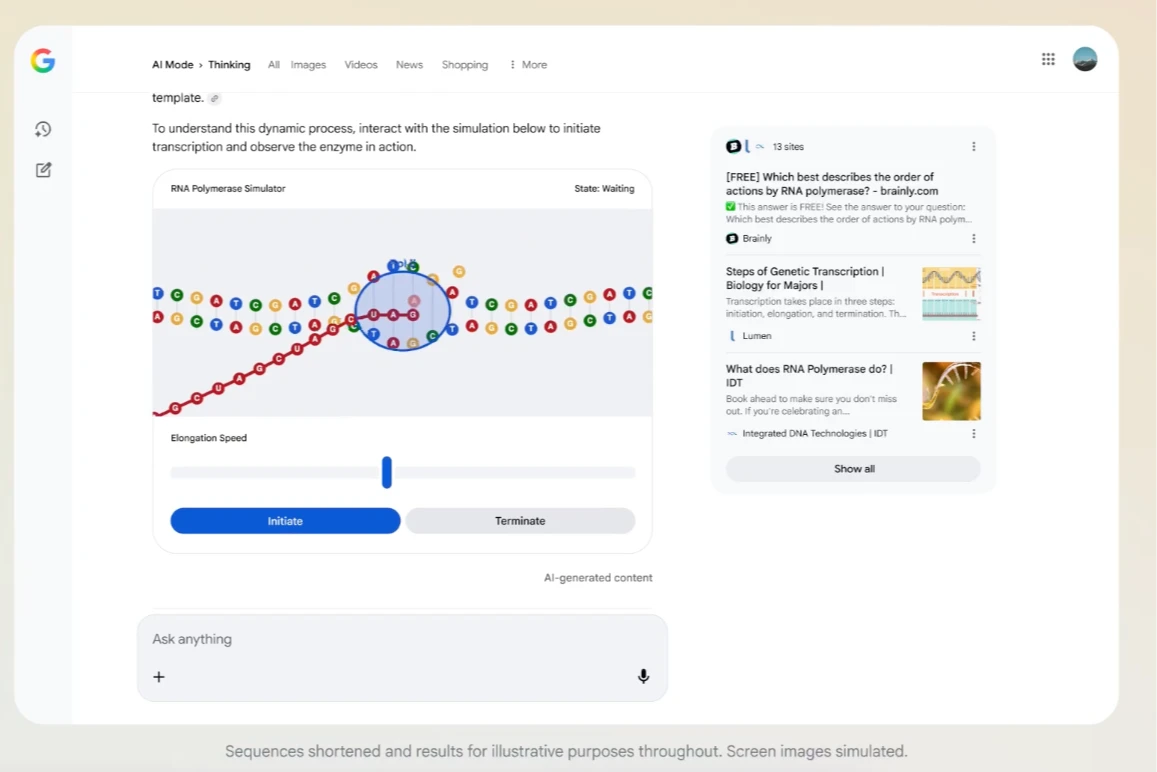 新模型Gemini 3將立即應用於Google的所有主要產品,包括搜尋服務,能夠以互動式圖形回答問題。例如輸入指示「請解釋RNA聚合酶的運作原理。轉錄過程分為哪些階段?原核細胞和真核細胞的轉錄過程有何不同?」Gemini 3在「思考」後,不僅會呈現搜尋過的文字答案,還會顯示互動圖表,讓用戶更深入學習理解。