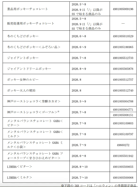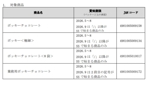 根據其官網顯示,受影響商品有多款「Pocky」(百奇)商品,包括「百奇巧克力」(ポッキーチョコレート)、「神戶烘焙巧克力」(神戸ローストショコラ)和含有GABA(γ-氨基丁酸)的Mental Balance巧克力(メンタルバランスチョコレートGABA)。這批商品在日本全國超級市場、便利商店和藥妝店等地販售。