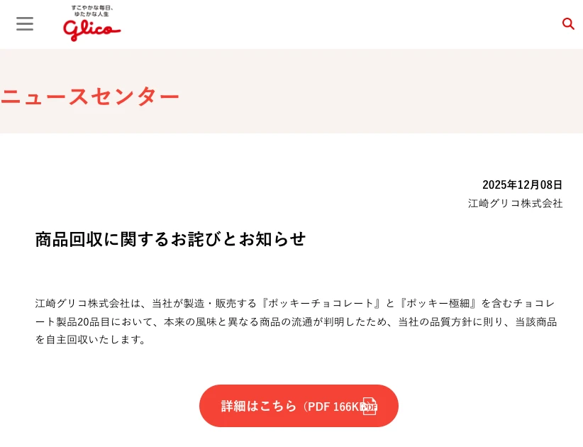 日本零食大廠「江崎格力高」(グリコ,Glico,又稱固力果)12月8日宣布主動回收20款巧克力產品,包括「百奇巧克力」和「百奇極細」等。