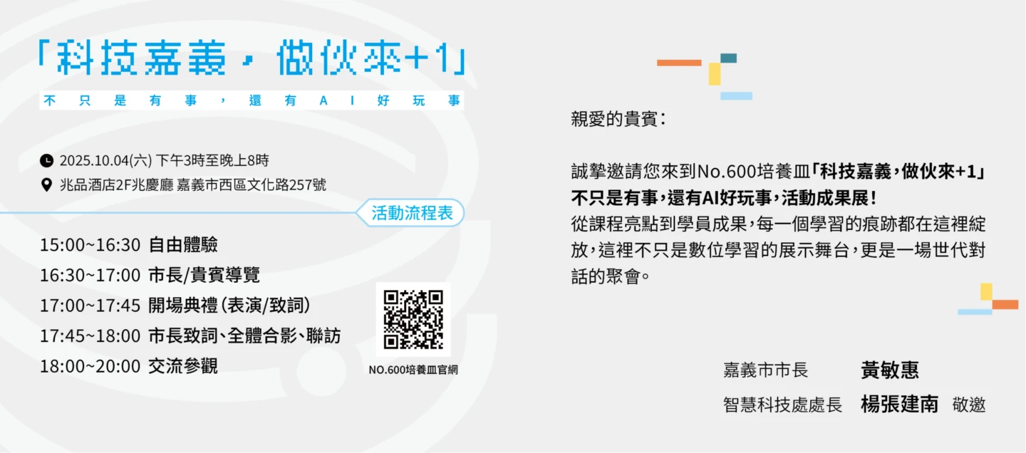 【社會中心/嘉義報導】嘉義市政府深耕多年的「全齡數位學習計畫—NO.600培養皿」114年度成果展,將於10月4日(星期六)下午3時在兆品酒店盛大登場!今年以「科技嘉義,做伙來+1」為主題,首度與全台最大青年盛會「有事青年節」串聯,打造一場融合科技創新、世代交流與城市未來想像的科技嘉年華。活動現場不僅匯聚Z世代最夯的 MBTI × AI 職涯探索分析與限量智能調酒體驗等趣味互動,也邀請築夢者街舞團隊與樂齡勇壯城樂團分別帶來充滿活力與感動的表演,從AI生成攝影、AR/VR沉浸式體驗到創新舞台展演,帶來「科技無齡、創意無限」的全新感官饗宴。嘉義市政府誠摯邀請市民一同開箱科技新鮮事,走進屬於嘉義市的數位新篇章!
