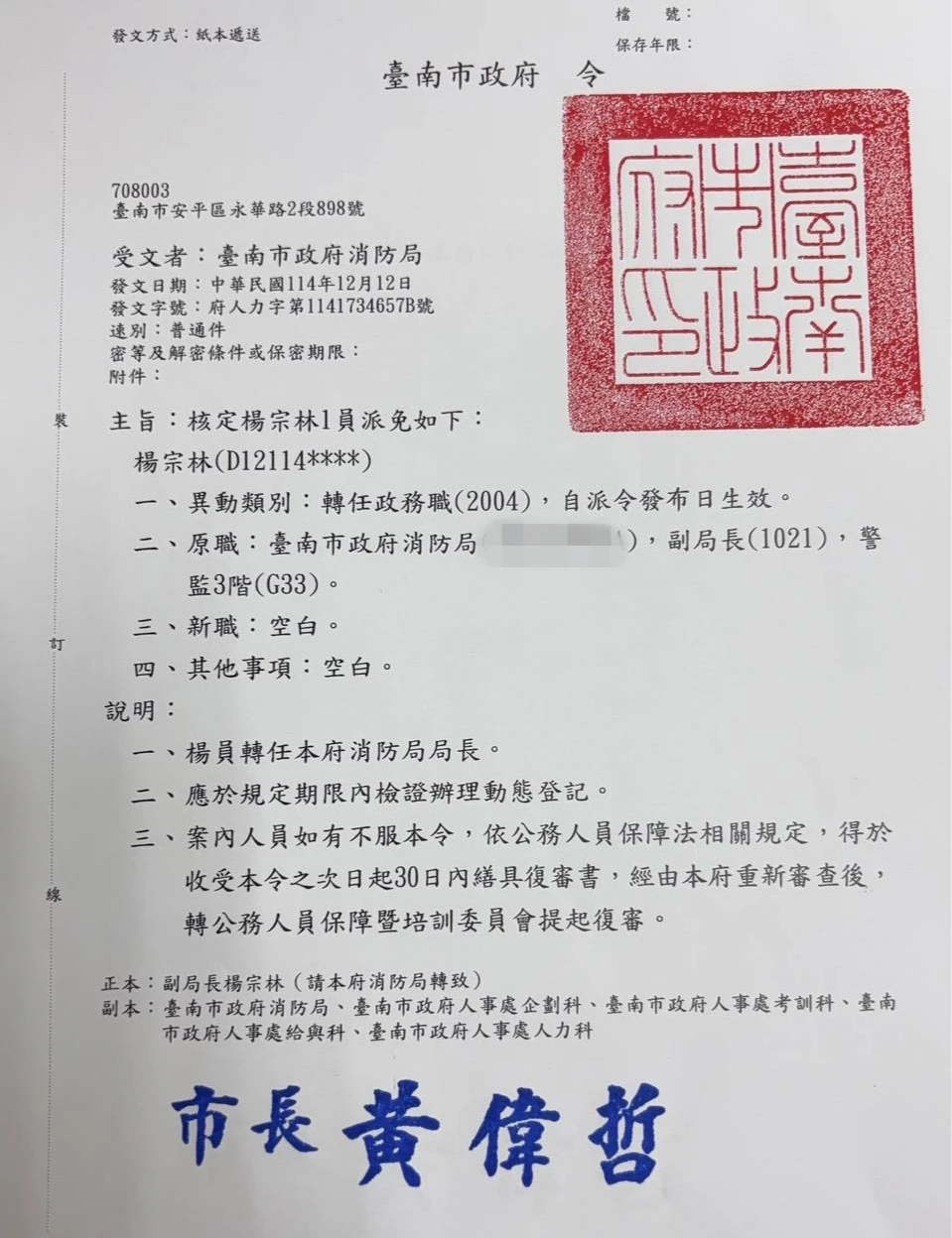 市府表示,請辭案獲准即日生效,將依程序妥善辦理後續事宜,確保消防各項勤務正常運作,市民安全與服務品質不受影響。
