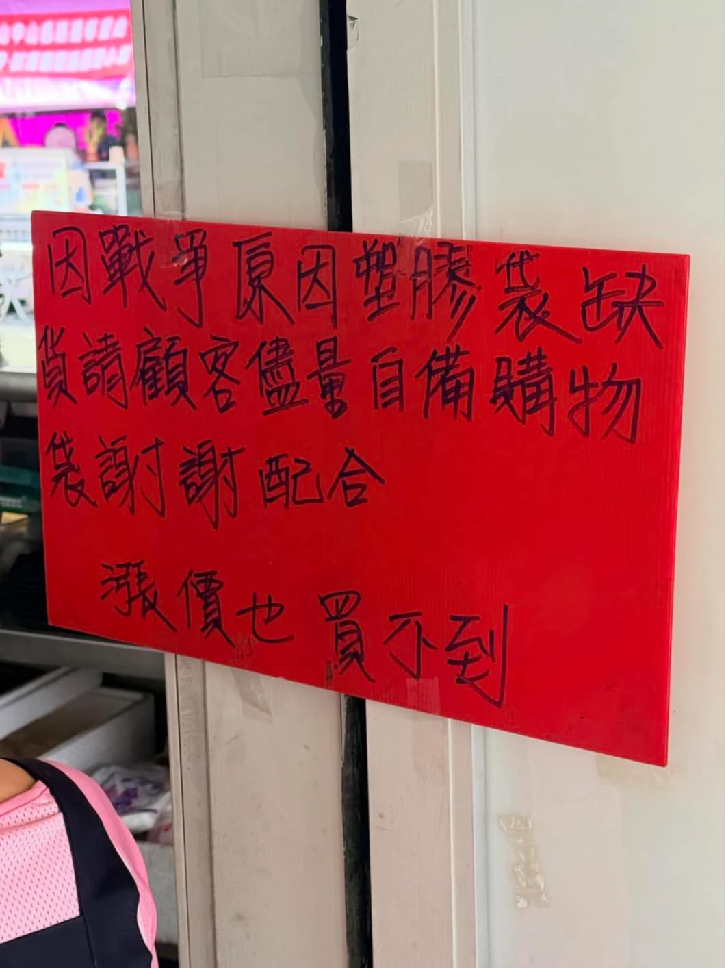 店家提醒,接下來不只是漲價,還可能面臨缺貨的情況,不是不想給袋子,而是「真的沒有袋子可以用」。所以拜託大家出門買東西,記得自備環保袋,或將家裡的塑膠袋重複利用,減少不必要的一次性使用。