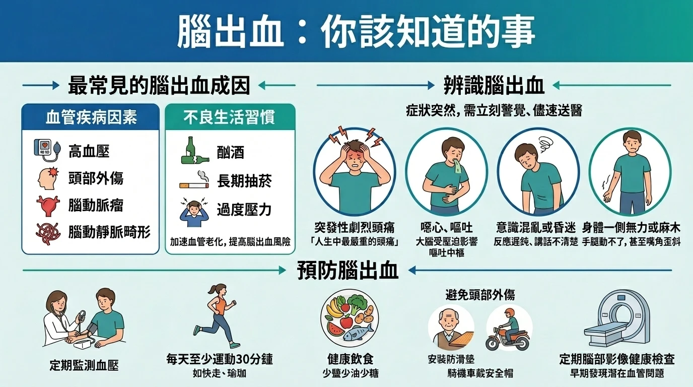 台大醫院官網一篇以「腦出血:你該知道的事」為題的衛教文,蔡欣熹說,最常見的腦出血成因包括高血壓、頭部外傷、腦動脈瘤或腦動靜脈畸形等腦血管疾病,以及酗酒、長期抽菸、過度壓力等不良生活習慣等因素,都會讓血管加速老化,提高腦出血風險。
