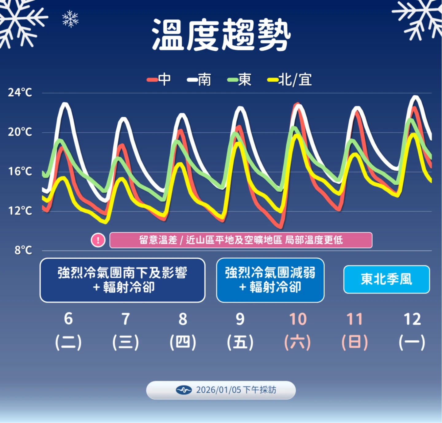 氣象署表示,明(7日)至周四(8日)將是這波強烈大陸冷氣團影響最顯著的時刻。屆時中部以北、宜蘭及花蓮天氣寒冷,其他地區早晚也冷。預測這兩天中部以北、宜蘭及金門、馬祖低溫僅9至13°C,南部、花東及澎湖約13至16°C,近山區平地及空曠地區溫度可能更低。
