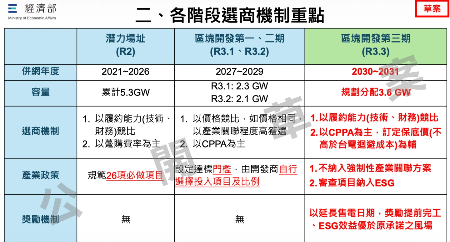 能源署下午則說明,區塊開發第3期的併網年度為2030年至2031年,容量規劃分配3.6GW,在選商機制部分將以履約能力競比,另外以CPPA為主,並以台電迴避成本訂為保底價。