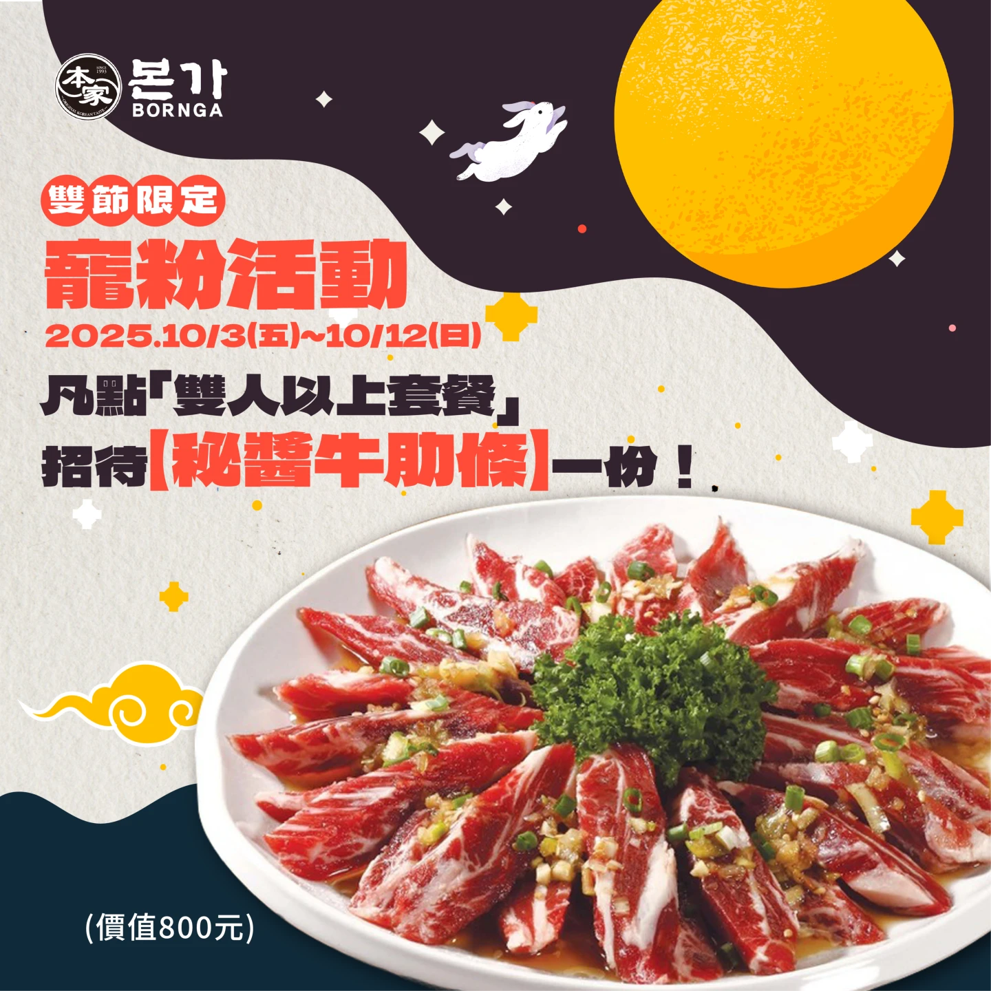 由韓國國民廚神、同時也是知名實境節目《黑白大廚》靈魂人物的「白種元」主廚所創立的「本家BORNGA韓式燒肉」,迎接中秋連假特別推出限定優惠,10月3日至10月12日點選雙人、四人至六人等套餐(價格2,680元至7,880元),不僅能享多款人氣燒肉與經典韓食,還可加碼獲贈價值800元的「秘醬牛肋條」。