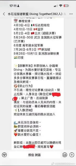 【記者陳雍仁/綜合報導】中國大陸跳水天后全紅嬋日前接受陸媒《人物》專訪,針對外界頻頻攻擊她身材走樣一事,公開喊話:「不要再罵我了!」但近日中國大陸網路流傳一系列截圖,一個規模達百人的微信群組,群起霸凌全紅嬋,而且群組名單中竟出現全紅嬋的奪金拍檔陳芋汐,引爆爭議,中國大陸官方急發聲明滅火,卻疑似想模糊焦點,反而遭到中國大陸網友砲轟。
