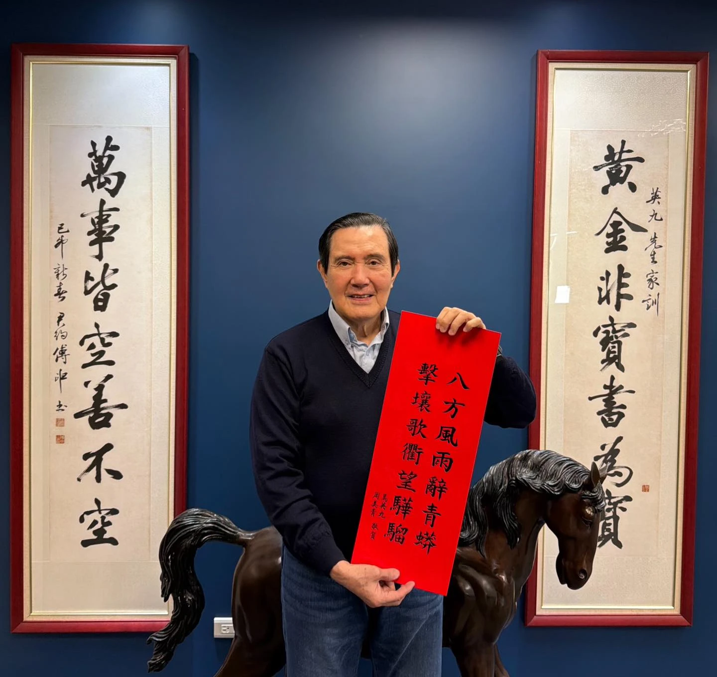 前總統馬英九一如既往親筆書寫春聯,他表示,雖自己屬虎,但因姓馬,每逢馬年也倍感親切,今年「雙馬合璧」春聯,寫下七言對聯「八方風雨辭青蟒,擊壤歌衢望驊騮」,以「辭青蟒(蛇)」迎「驊騮(駿馬)」的典故,展現文人氣勢及期許。