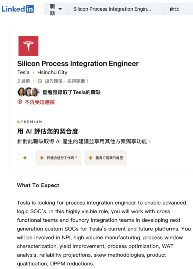 「INSIDE硬塞的網路趨勢觀察」和「iCook愛料理」共同創辦人在臉書發文表示,「TeraFab」不只是一個工廠計畫,它已經在現實中觸發了一場全球半導體人才爭奪戰。特斯拉已在LinkedIn上,針對台灣新竹開出「Silicon Process Integration Engineer(矽製程整合工程師)」職缺。