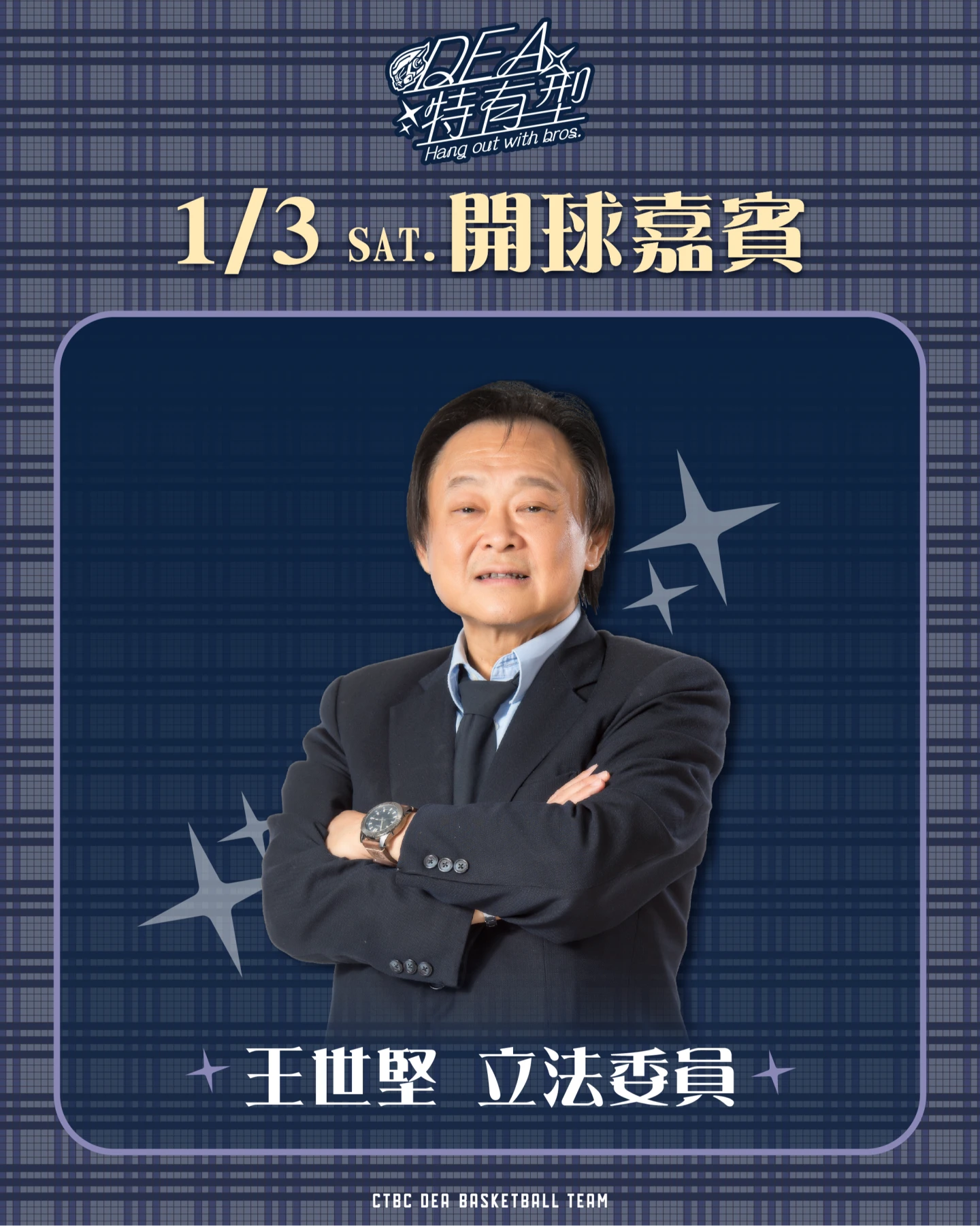 【記者陳雍仁/綜合報導】新北中信特攻籃球隊將於12/31(三)、1/3(六)、1/4(日)舉辦「DEA特有型」主題日,2026年中信特攻主場首戰1/3(六)將邀請到最有型的重量級嘉賓-立法委員王世堅到「特攻基地」新莊體育館,為中信特攻從從容容地開球、和線人們一起游刃有餘地應援!