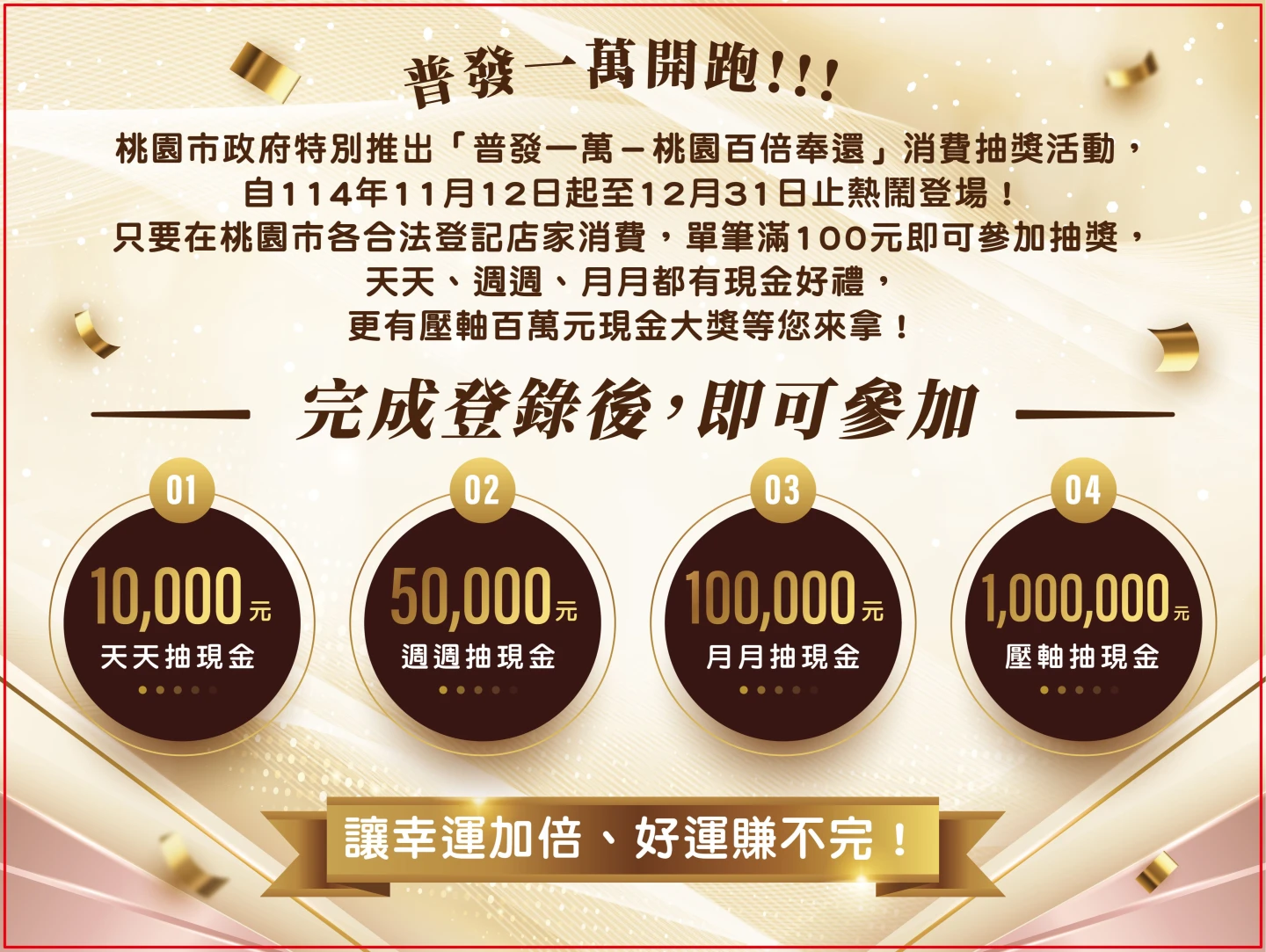 【記者盧麗蓮/綜合報導】因應中央普發現金1萬元,桃園市府推出「普發一萬.桃園百倍奉還」活動,只要在桃園消費滿100元即可登錄抽大獎,且獎項眾多,天天抽1萬、月月抽10萬,最終壓軸抽100萬元現金1名。發票登錄時間自昨天開始起跑,民眾越早登錄越有機會抽到獎。