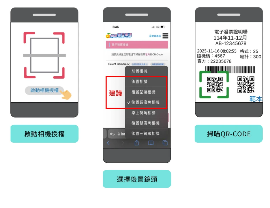 使用官網掃描功能,掃描發票QR-Code完成發票登錄程序。或採用手動輸入,相關輸入步驟如同傳統發票輸入說明。