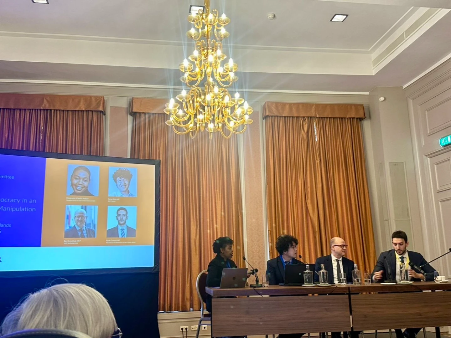 范雲、沈伯洋亦在會中接力發聲,揭露中國威權滲透與資訊戰手法。沈伯洋以「政治操弄時代下的民主防衛」為題,分析中國以虛實整合方式滲透台灣社會,並警告AI自動化散播陰謀論的危害,呼籲以法律制度強化防禦。