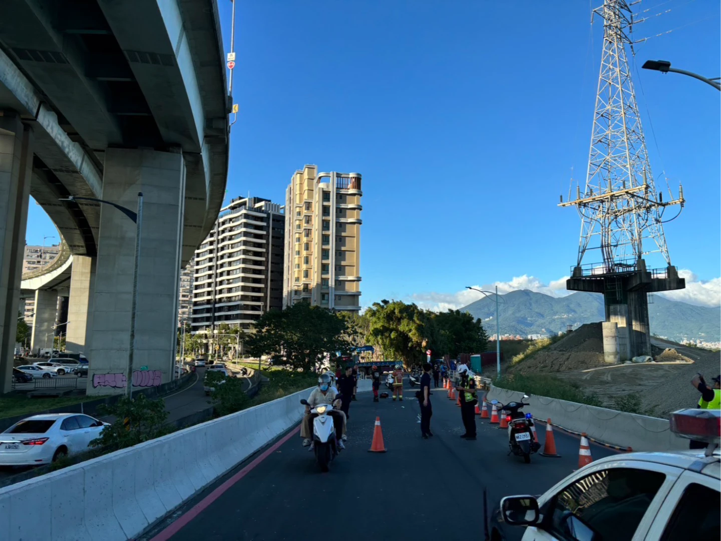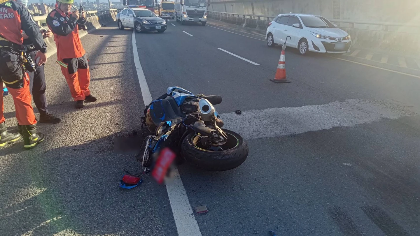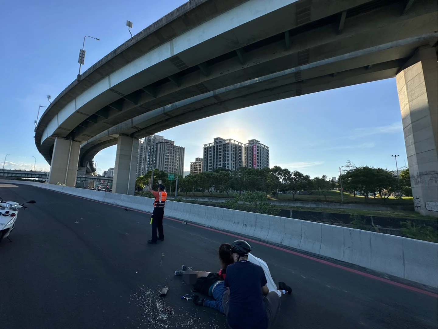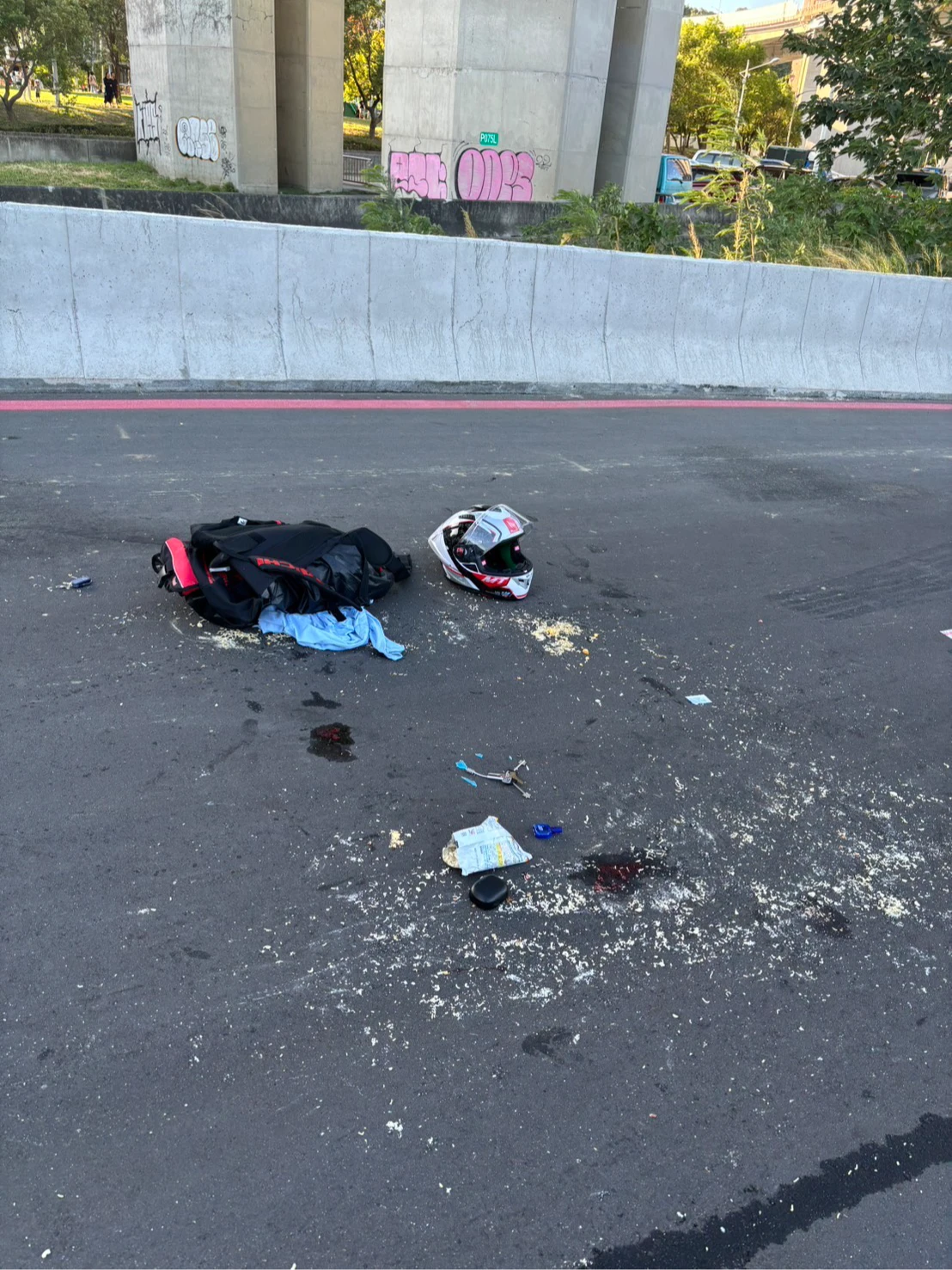 據悉,陳男今天下午獨自騎乘紅牌重機,從台64線往八里方向行駛,行經9公里轉彎處,不明原因自撞護欄,陳男從約20公尺高、相當6層樓的高架道路墜落成洲七路。