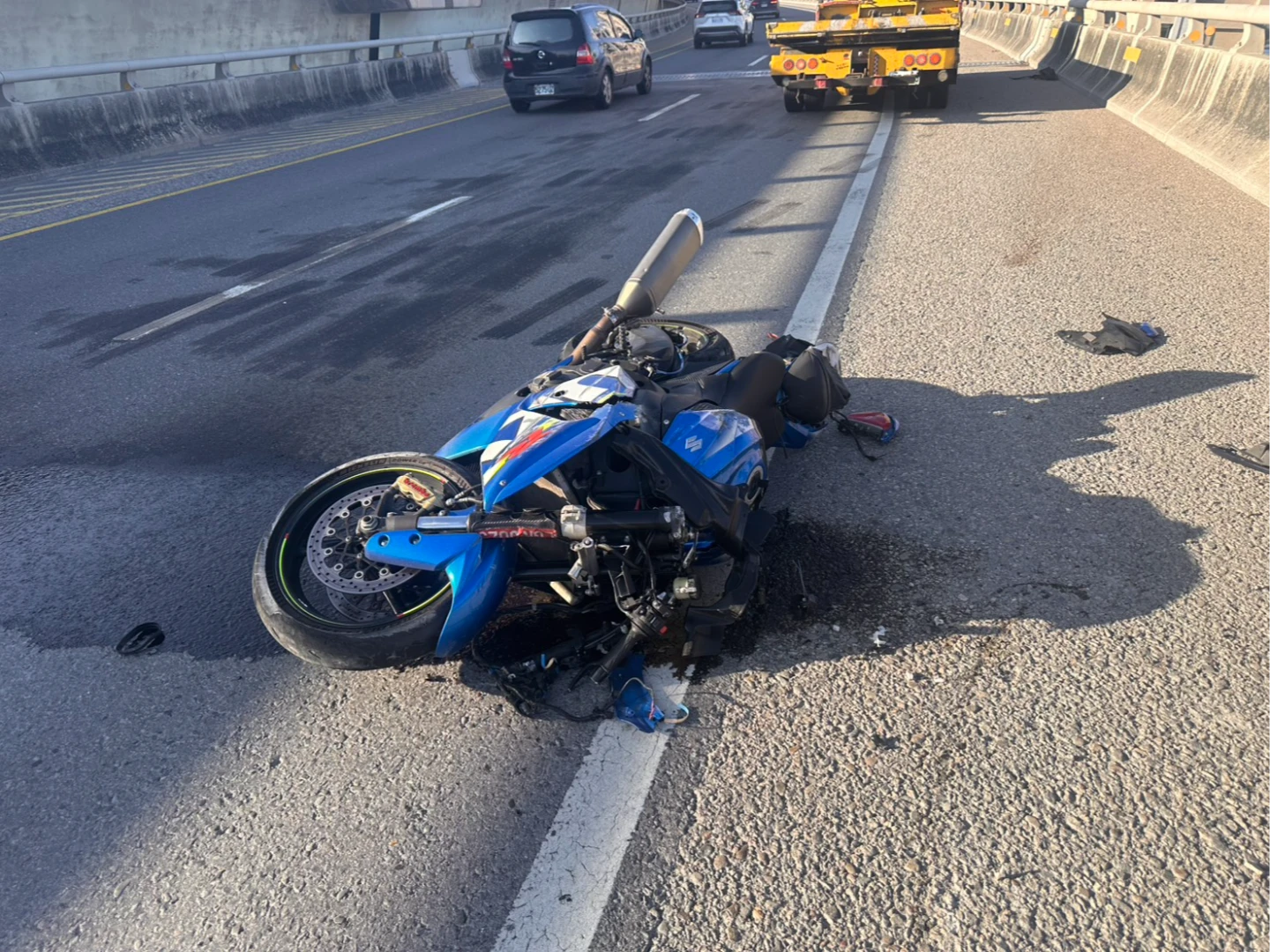 【記者林志青/新北報導】台64線東西向快速公路八里新店線,今天下午發生紅牌重機疑似自摔車禍,陳姓騎士(22歲)從約6層樓高的高架道路摔落路面,當場失去生命跡象,路過民眾急忙報警,警消將陳男送淡水馬偕醫院急救,直到晚間宣告不治。事故原因與肇責尚待警方調查釐清。
