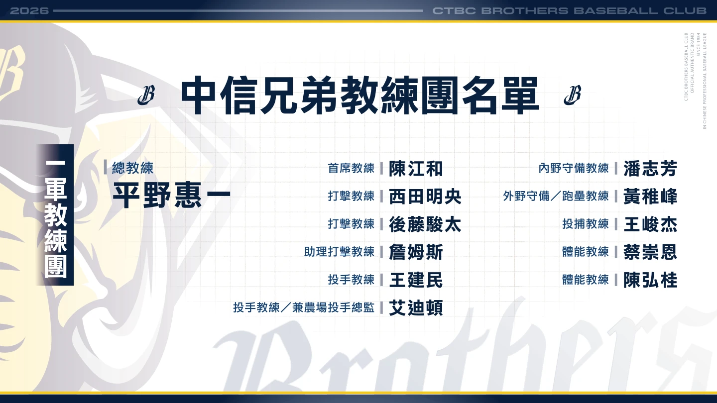 【記者陳雍仁/綜合報導】中信兄弟今(2日)在屏東展開春訓,開訓典禮上公開最新完整教練團名單,球團表示休賽季期間持續推動海外訓練與專業交流,並同步規劃2026年度春訓與整體訓練藍圖。面對新球季挑戰,球團也進一步調整並強化教練團分工與專業化配置,期望接軌國際職棒潮流,透過更精準、系統化的訓練規劃,協助選手提升動作品質與競技表現,於新球季展現穩定戰力、爭取佳績。