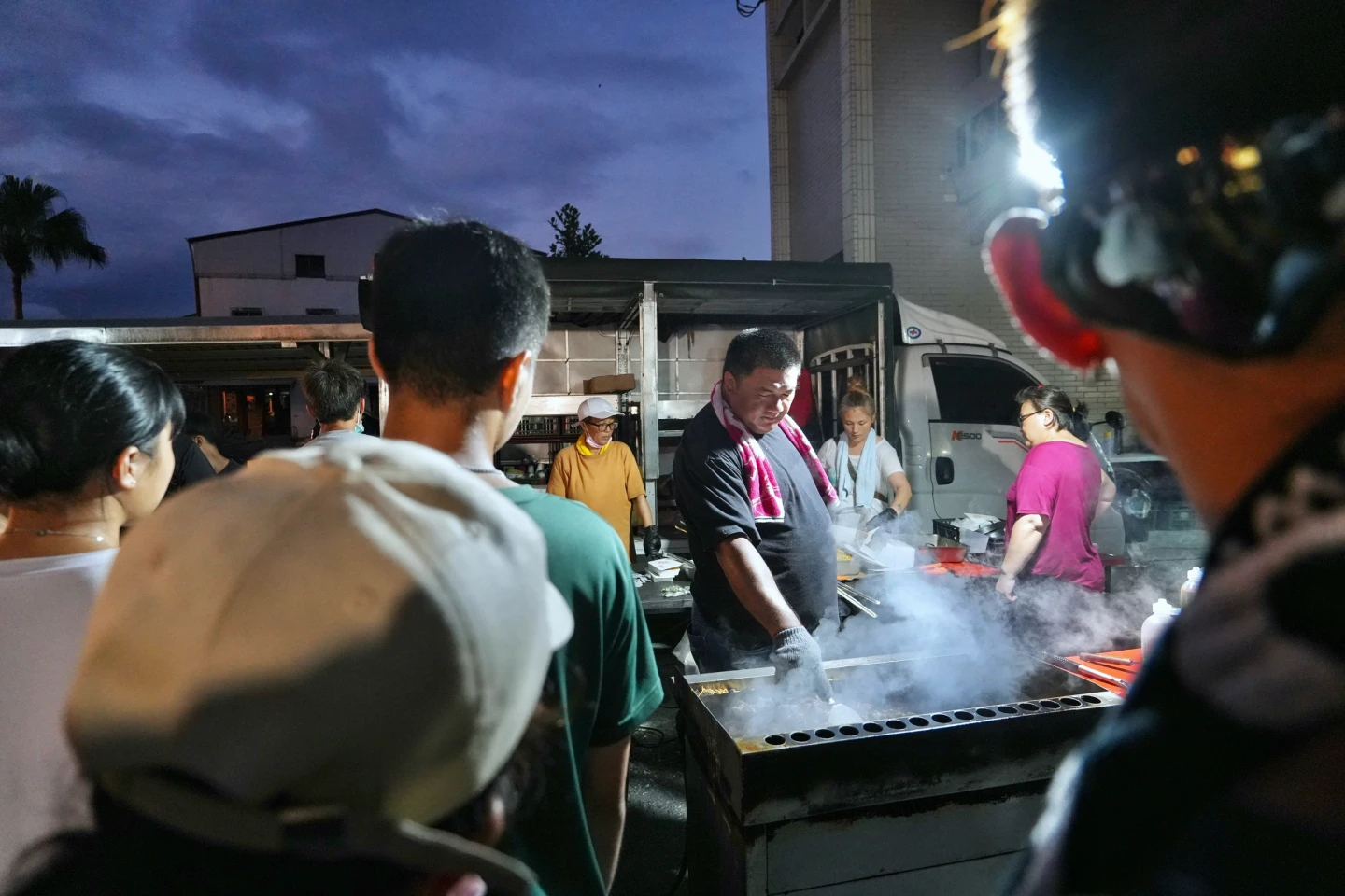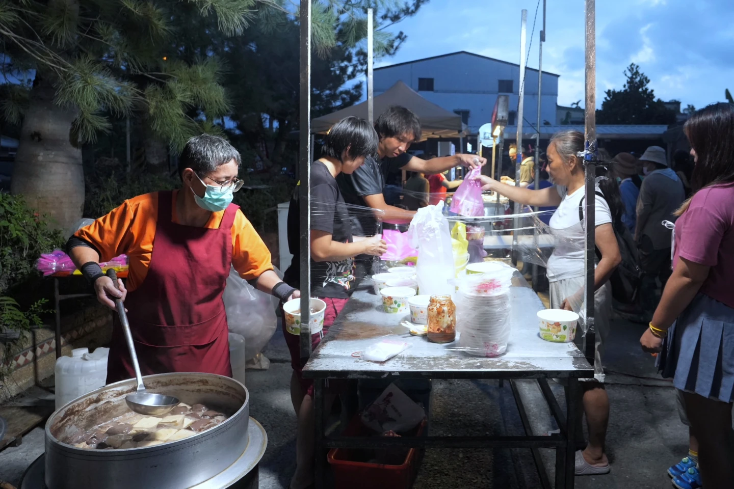 光復鄉遭遇洪災衝擊已屆兩週,今晚是中秋節,光復鄉代表會主席廖翊鈞找來約10家攤商,在代表會建築物前的小廣場擺攤,免費提供美食,希望撫慰災民,也給予連日協助的志工、國軍支持,攤位則包含雞排、蚵仔煎、麻辣鴨血、黑糖珍珠奶茶、手工布丁、碳烤、爆米香等。