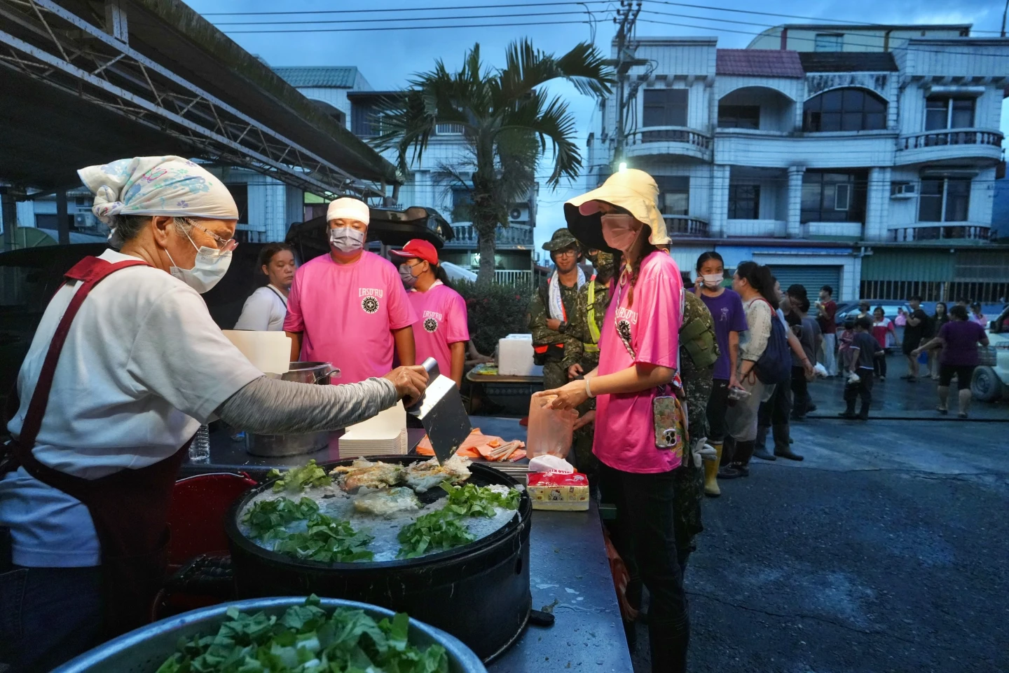 現場幾乎每個攤位都大排長龍,多數為當地居民,也有志工、國軍前來領取,攤位業者則忙著將一份又一份美食盛裝,交給這些重建家園的人們。