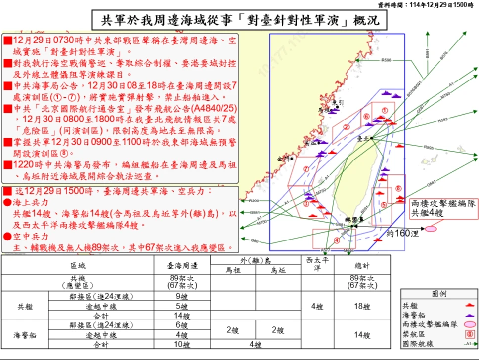 另稱,截至昨天下午3時許,國軍共偵獲敵艦1、海警船各14艘;空中兵力部分,主、輔戰機及無人機共89架次,其中67架次進入我應變區,顯示國軍有能力掌握敵動態。