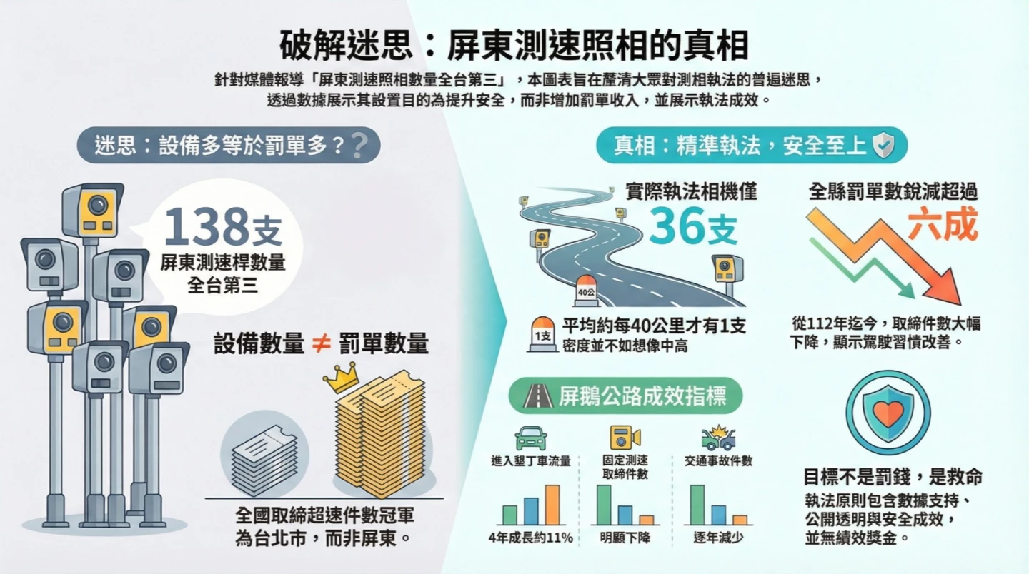 屏東縣警局交通警察隊澄清,138處測速桿中,實際上真正裝有主機、持續執法的固定桿僅36支,以全縣道路總長度約1460公里換算,平均每40公里設置1支,與外界「密度高」的印象有極大落差。