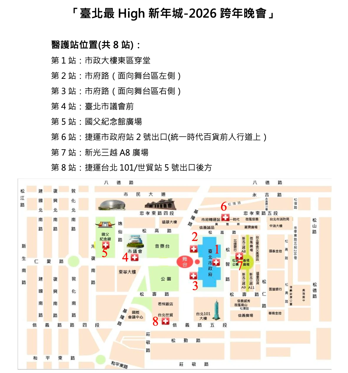 台北跨年|估20萬人湧入 衛生局整備8醫護站+9部救護車、4組機動巡檢救護人力