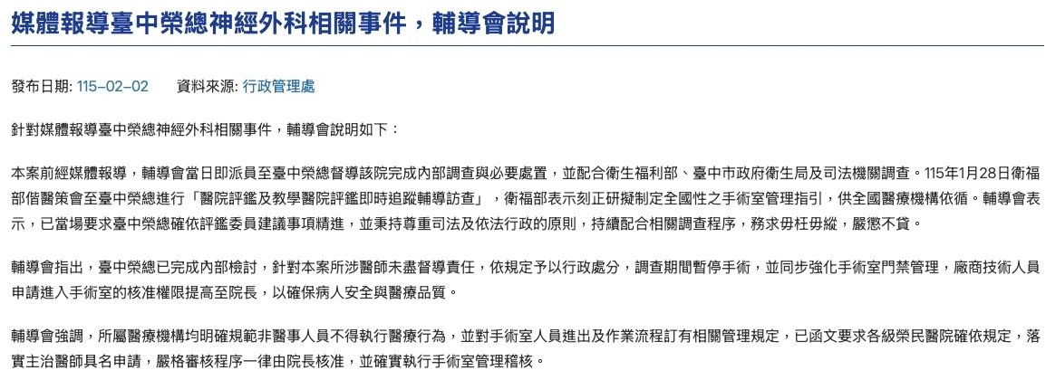【記者王煌忠、陳力維/綜合報導】《知新聞》日前獨家披露中榮台中榮總醫師疑似讓醫療器材廠商人員違法代為執行手術影片,國軍退除役官兵輔導委員會(退輔會)發布聲明,表示在事件曝光當日即派員督導院方完成內部調查與處置,並全力配合衛福部、台中市衛生局及司法機關進行調查。衛福部偕同醫策會已於1月28日前往台中榮總進行即時追蹤輔導訪查,並表示正研擬全國性手術室管理指引;退輔會對此強調,已要求院方依評鑑委員建議精進,秉持尊重司法、依法行政原則,務求毋枉毋縱,嚴懲不貸。