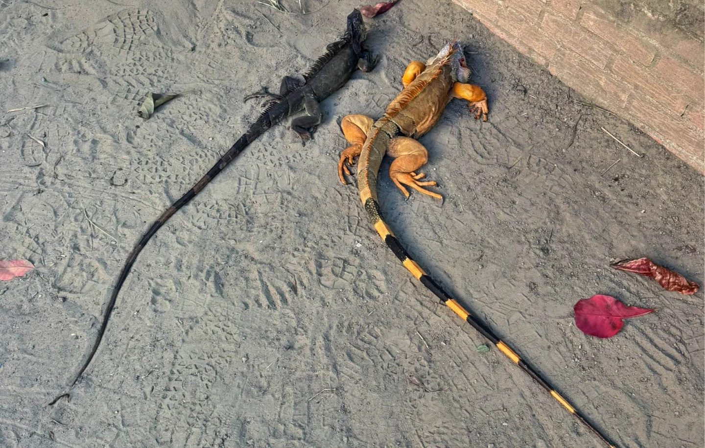 【記者王志弘/台南報導】台南永康祥合公園2025年出現一隻體長超過1公尺的綠鬣蜥,不僅身形嚇人,散發「霸王色」金黃光澤,還動作矯捷多次躲過獵槍狙擊。直到市府農業局日前派出局內「神射手」對決,鷹眼擊落公園霸主,順利將其緝拿歸案,終結長達一年的「巨蜥傳說」。