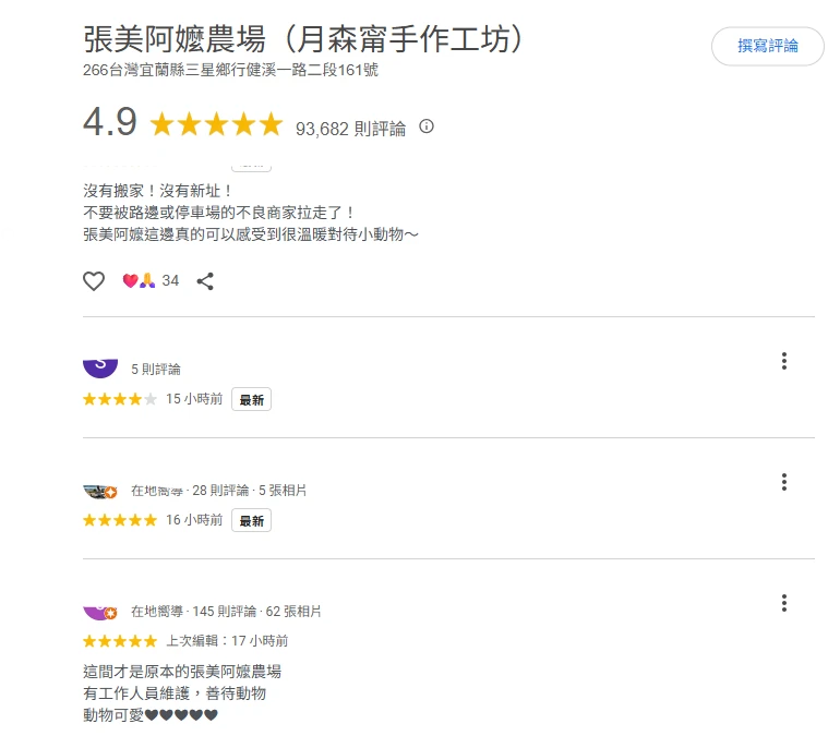 GOOGLE評論中,可見張美阿嬤農場出現許多支持者,「這間才是原本的張美阿嬤農場,有工作人員維護,善待動物,動物可愛」、「沒有搬家!沒有新址!不要被路邊或停車場的商家拉走了!」