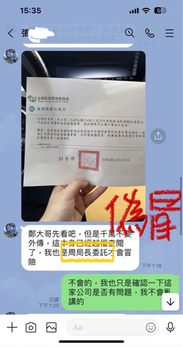 詐團還謊稱「東南慧通」已繳納30億元給「金融監督管理委員會」作為保證金,並出示偽造的收據文件,企圖以金管會及刑事局長的名義,使陳男誤信後匯款投資。
